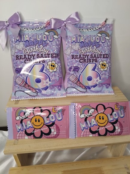 Custom Crisp Packets: Our most popular item! We take your favourite classic crisps and wrap them in high-quality, glossy custom packaging featuring the guest of honour’s name and photo.