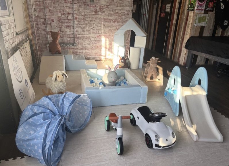 Blue and white and Pastel Soft Play Packages - from £130 - Large square ball pit with pastel balls, slide set, obstacle set, tower building blocks set, 3 balance bikes, 1 rocking horse, 2 animal hoppers, soft anti-slip mats