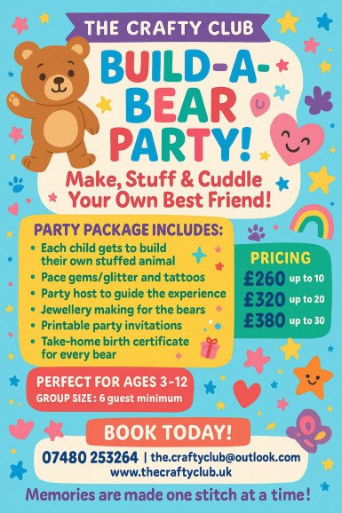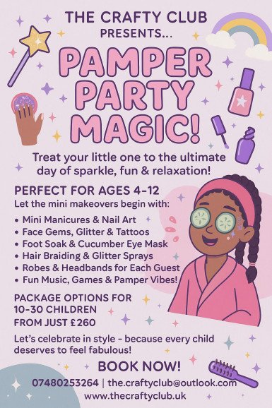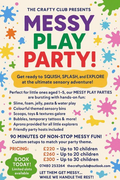 β’ Other party themes available: messy play, pamper parties, craft workshops, and βBuild a Beatβ music sessions.
