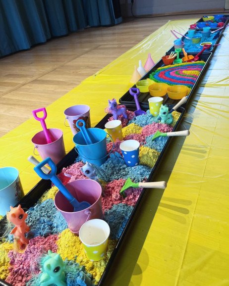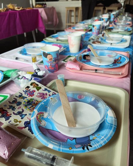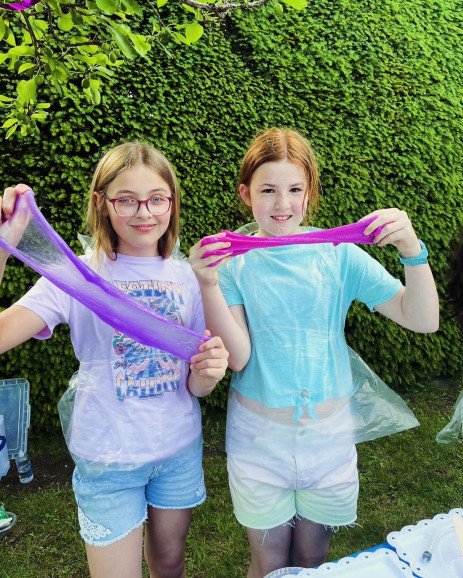 We deliver a fully hosted 90-minute session with all materials provided: non-toxic slime bases, glitter and charms, pre-treated cotton tees, dyes, gloves and protective covers. Our friendly, experienced team run age-appropriate activities, manage tidy-up as part of the service, and make sure every child gets a chance to be creative and take home keepsakes. If you want a quieter option, we can adapt the session to focus on one activity or tone down the sensory elements for younger groups.