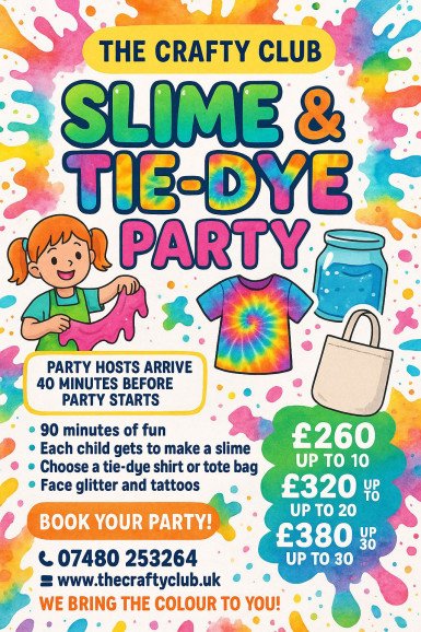 Double the fun, double the creativity. The Crafty Club brings hands-on, mess-friendly parties straight to your door β perfect for kids who love to make, experiment and take home their own masterpieces. Our flagship Slime & Tie-Dye Party Combo pairs stretchy, squishy slime-making with colourful tie-dye t-shirt design for a high-energy, sensory-rich experience thatβs ideal for birthdays, playdates, school events, and community gatherings.